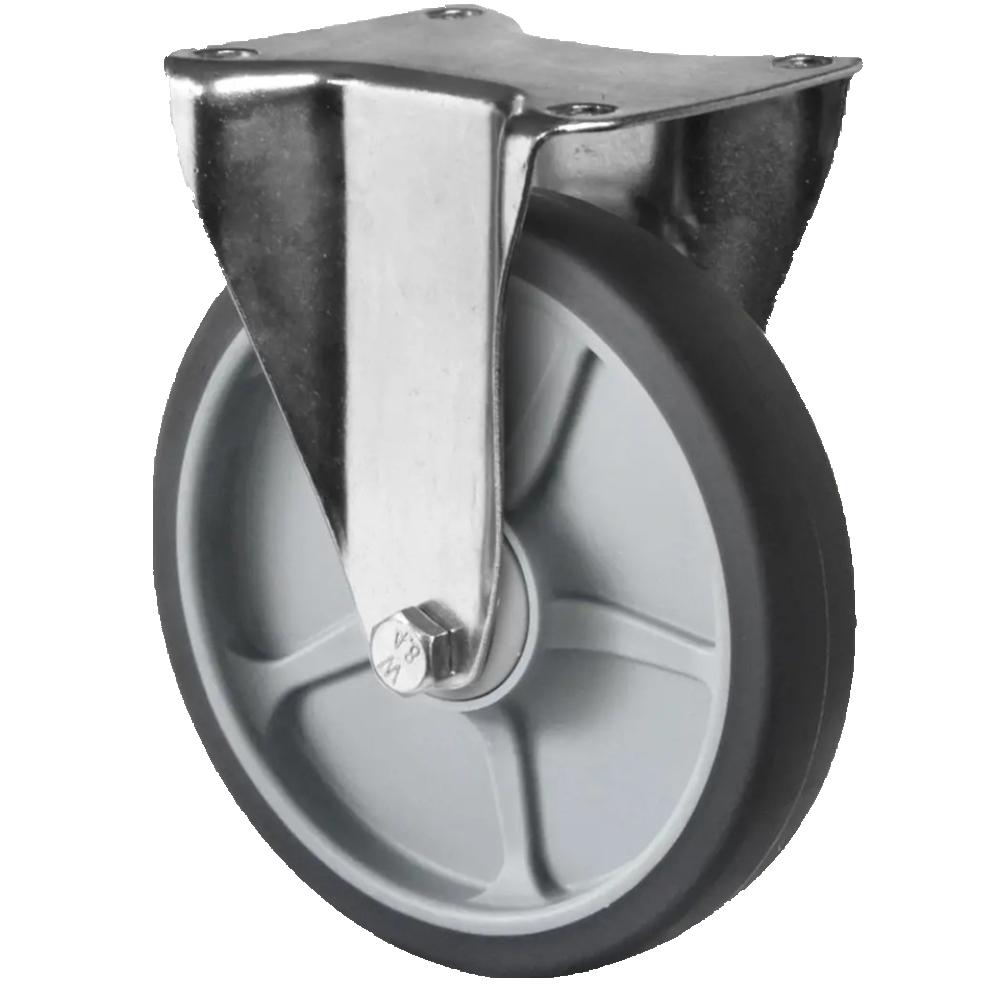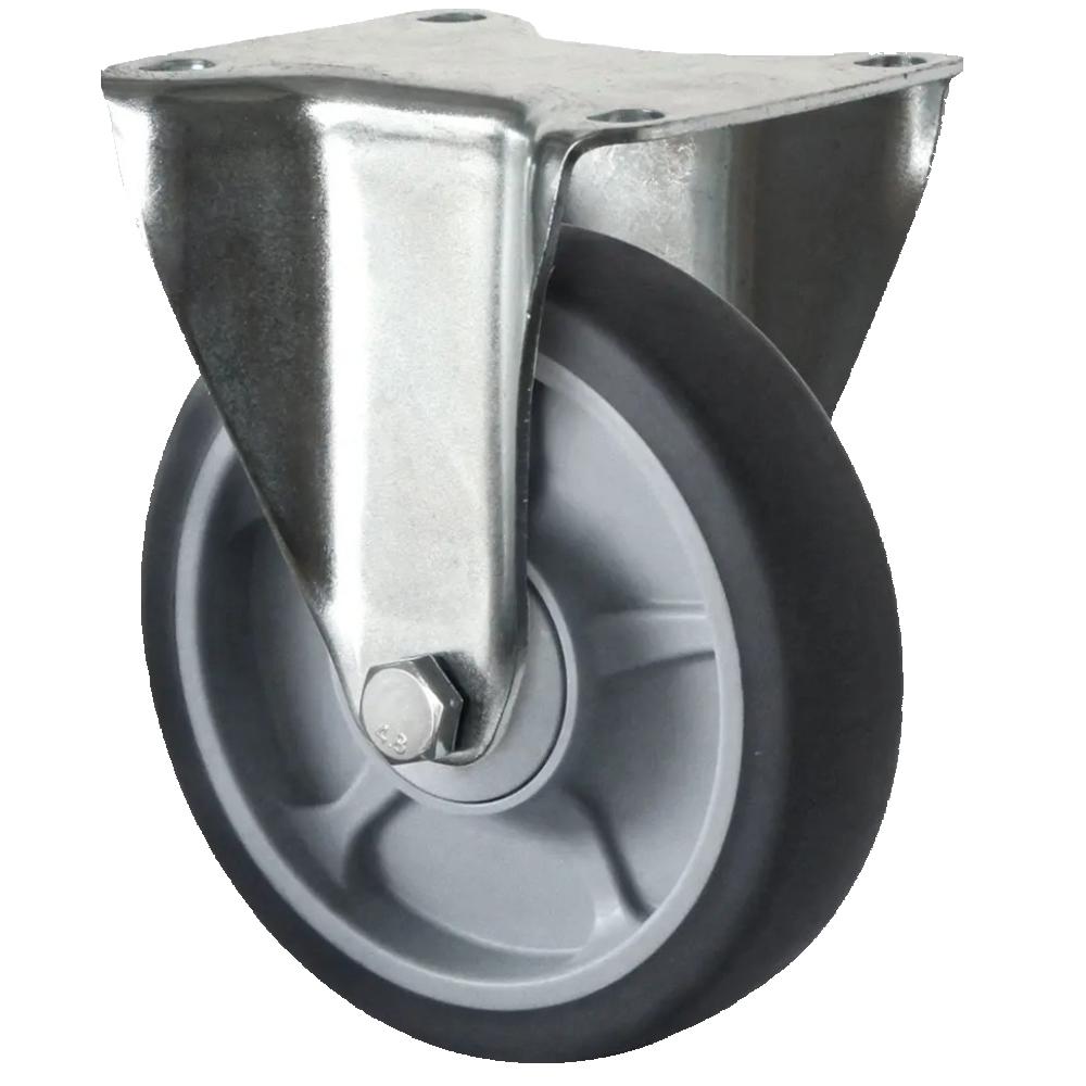 • Zestaw kołowy stały to wytrzymała rolka transportowa z korpusem koła z szarego polipropylenu i elastyczną bieżnią z elastomeru termoplastycznego (65 do 75° Shore A) oraz z ocynkowanej blachy stalowej.