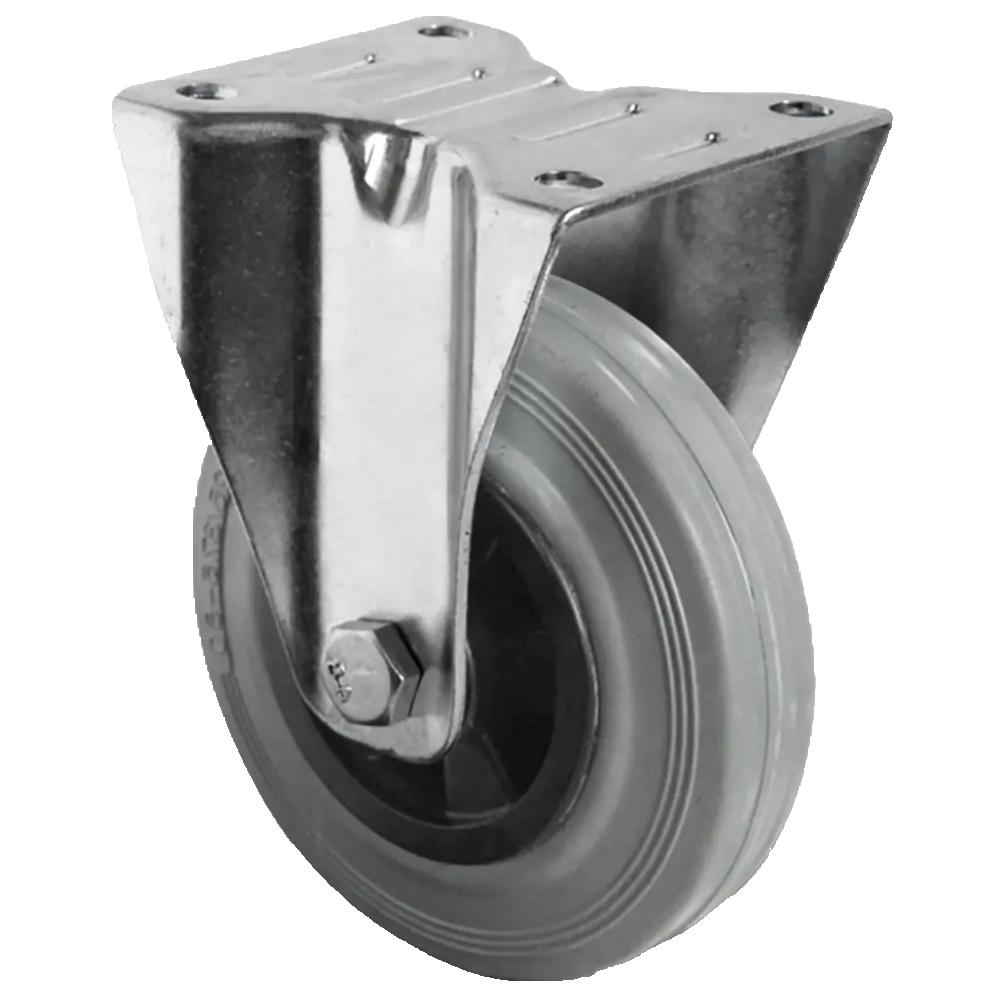 - Zestaw kołowy stały to wytrzymałe koło transportowe z korpusem koła z czarnego polipropylenu i odporną bieżnią z pełnej gumy (85° Shore A) w kolorze szarym, a także z ocynkowaną obudową z blachy stalowej.