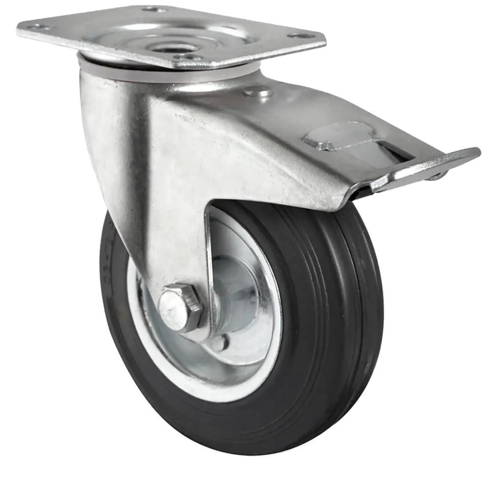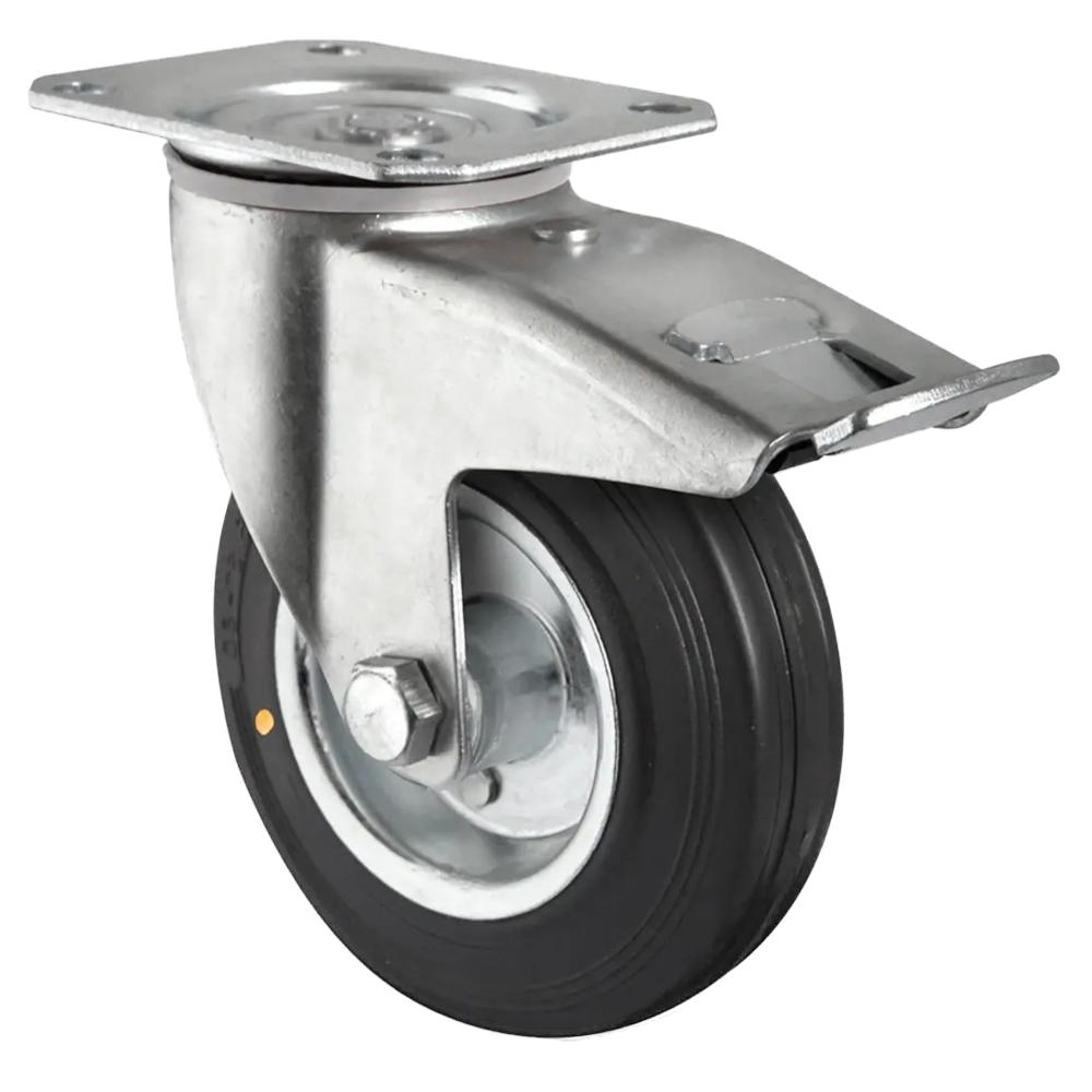 - Zestaw kołowy skrętny z całkowitym hamulcem składa się z elektroprzewodzącego koła z korpusem koła wykonanym z niebieskiej blachy stalowej ocynkowanej oraz czarnej bieżni z pełnej gumy o twardości 85° Shore A.