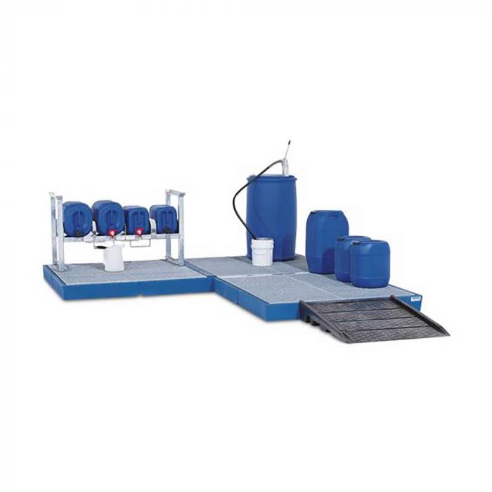 Sprzęt | Element podłogowy jest wykonany z przyjaznego dla środowiska, wysoce odpornego na uderzenia i wstrząsy polietylenu (PE). PE jest wysoce odporny chemicznie na oleje, kwasy, zasady i inne agresywne substancje i ma bardzo niską całkowitą wysokość 150 mm. kilka elementów podłogowych można łatwo łączyć w celu ochrony większych obszarów. Praktyczne rampy załadunkowe są dostępne jako opcja dla wygodnego załadunku elementów podłogowych. Zdejmowane, ocynkowane ogniowo kraty służą jako poziom pozycjonowania. Element podłogowy jako wanna wychwytowa z ważną w całym kraju ogólną aprobatą techniczną nr Z-40.22-491 wydaną przez DIBt w Berlinie. |