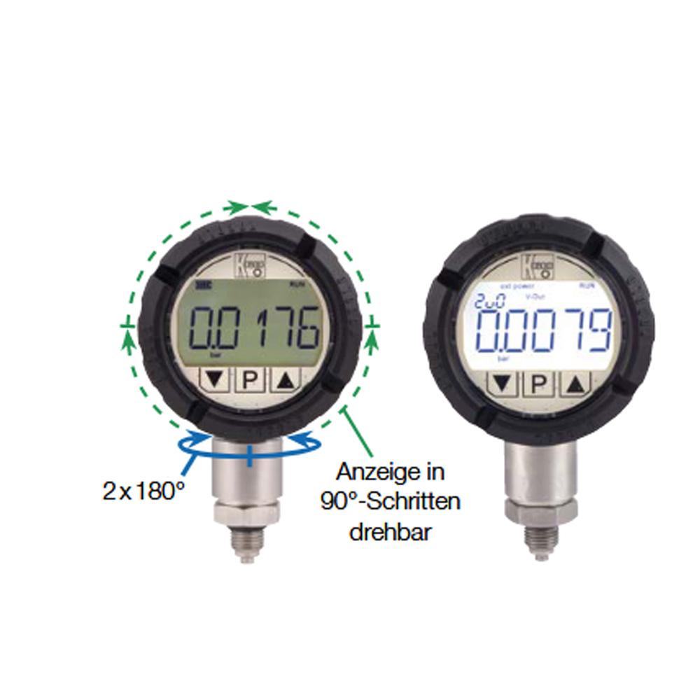 - Cyfrowy manometr może być łatwo obsługiwany za pomocą menu w celu dostosowania do lokalnych warunków ustawienia punktu zerowego (tarowania) i jest dostępny we wszystkich wymaganych zakresach pomiarowych od 600 mbar w górę, oprócz standardowych zakresów pomiarowych w barach i psi od -1...0 do +1600 bar.